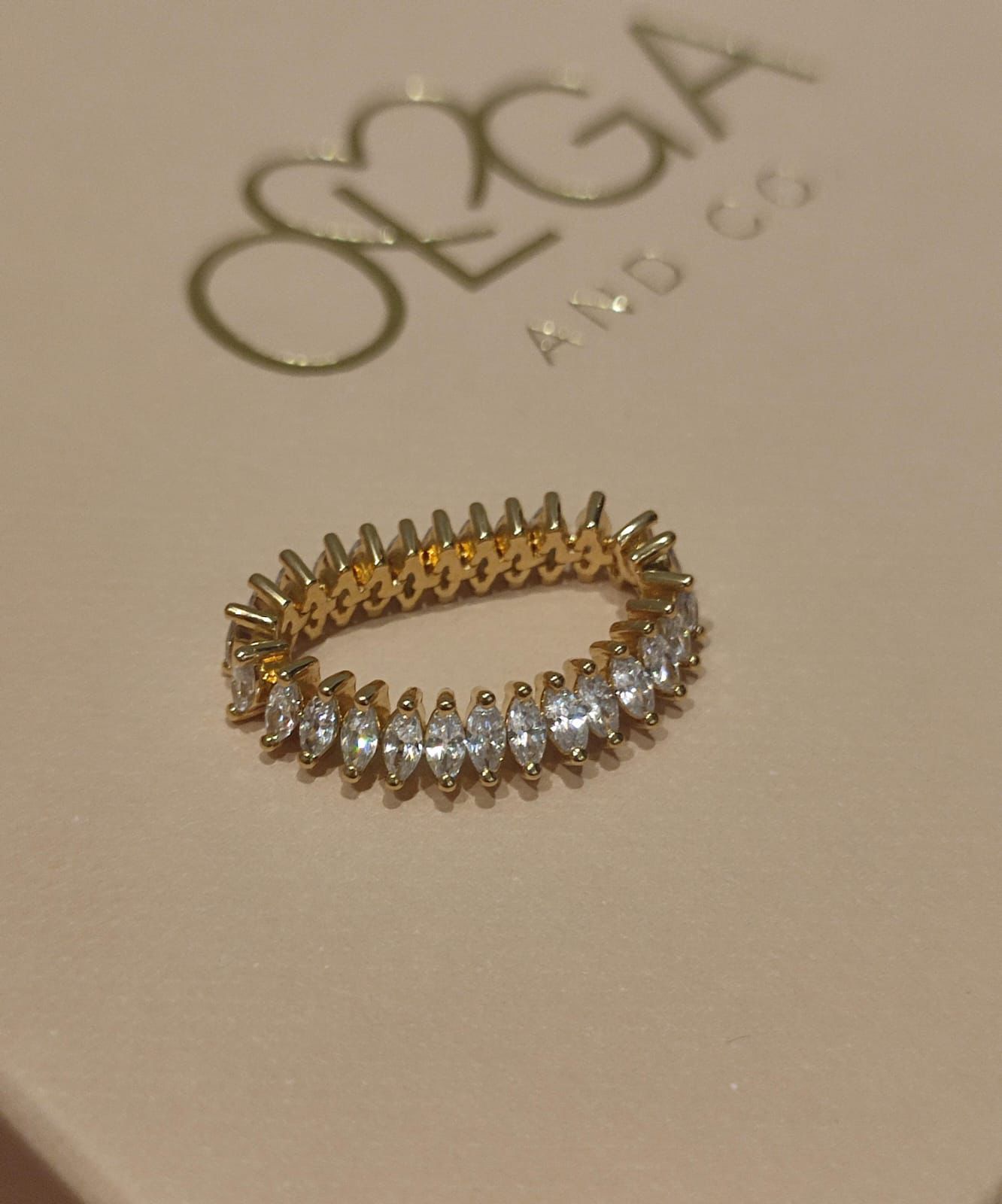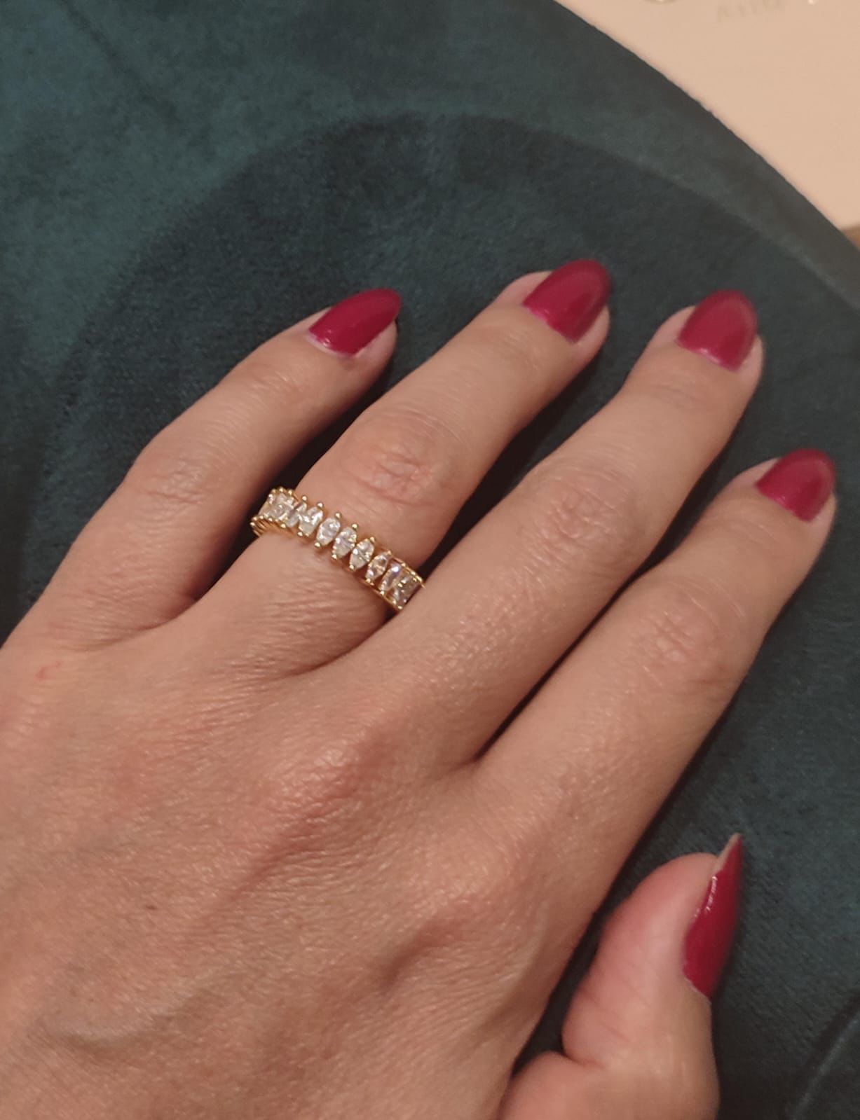 Aliança em prata 925 com banho de ouro 18k ou ródio. Inteira com cravação de zircônias cristal em formato navete.