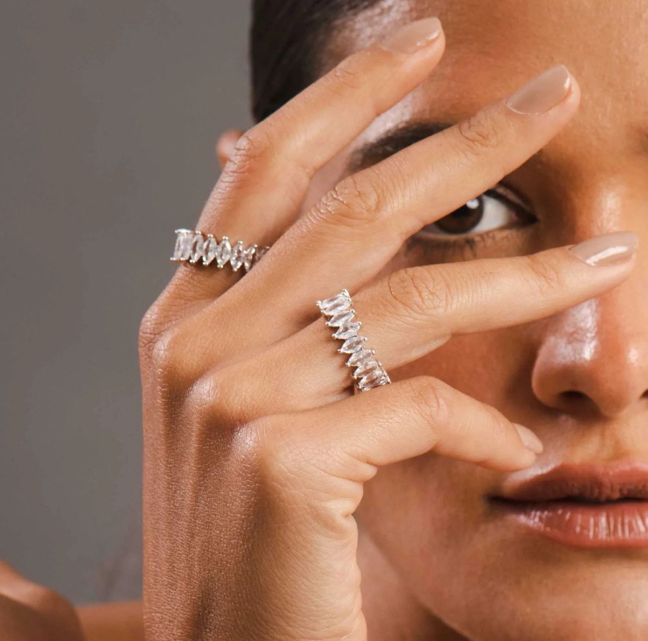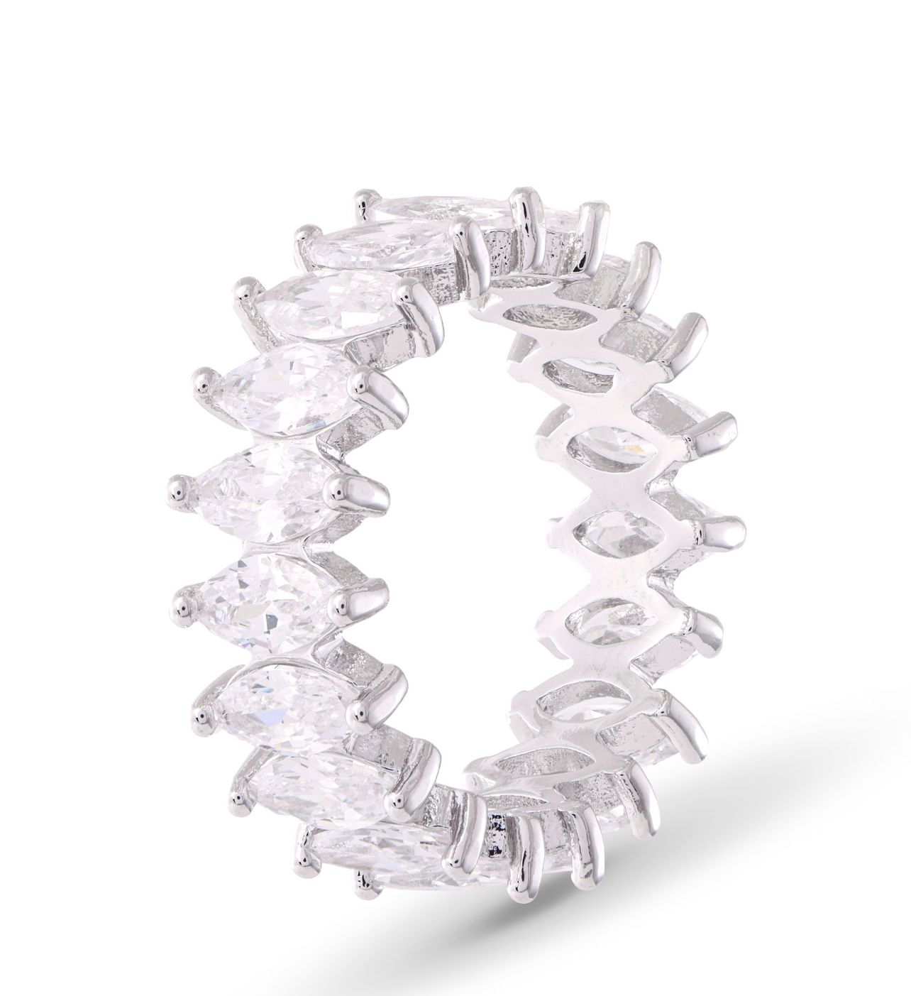 Aliança em prata 925 e banho de ródio toda com cravação de zircônias em formato navete na cor cristal.