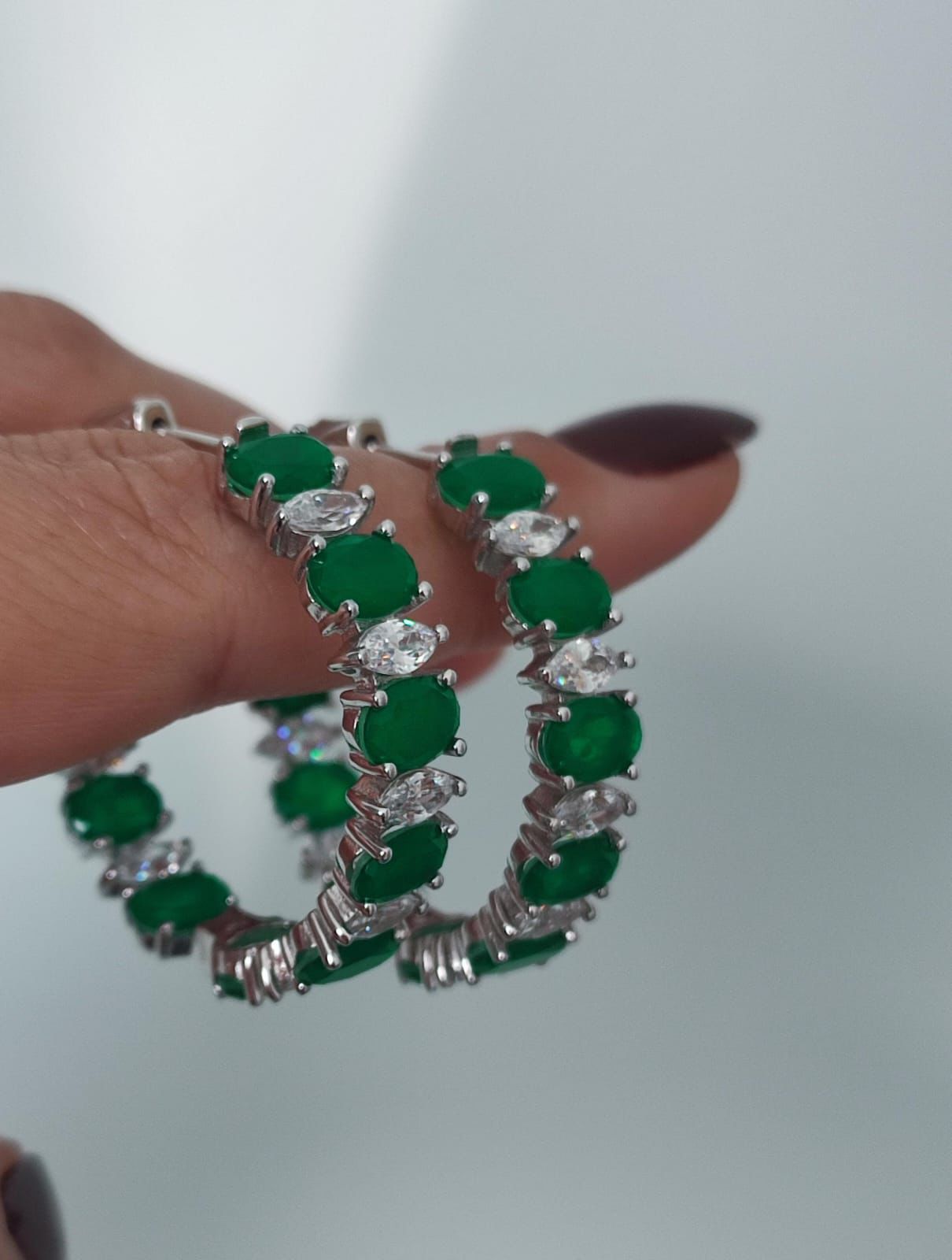 Brinco argola em prata 925 e banho de ródio com zircônias cristal e esmeralda.