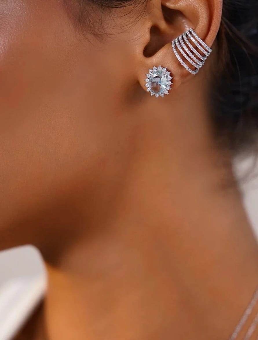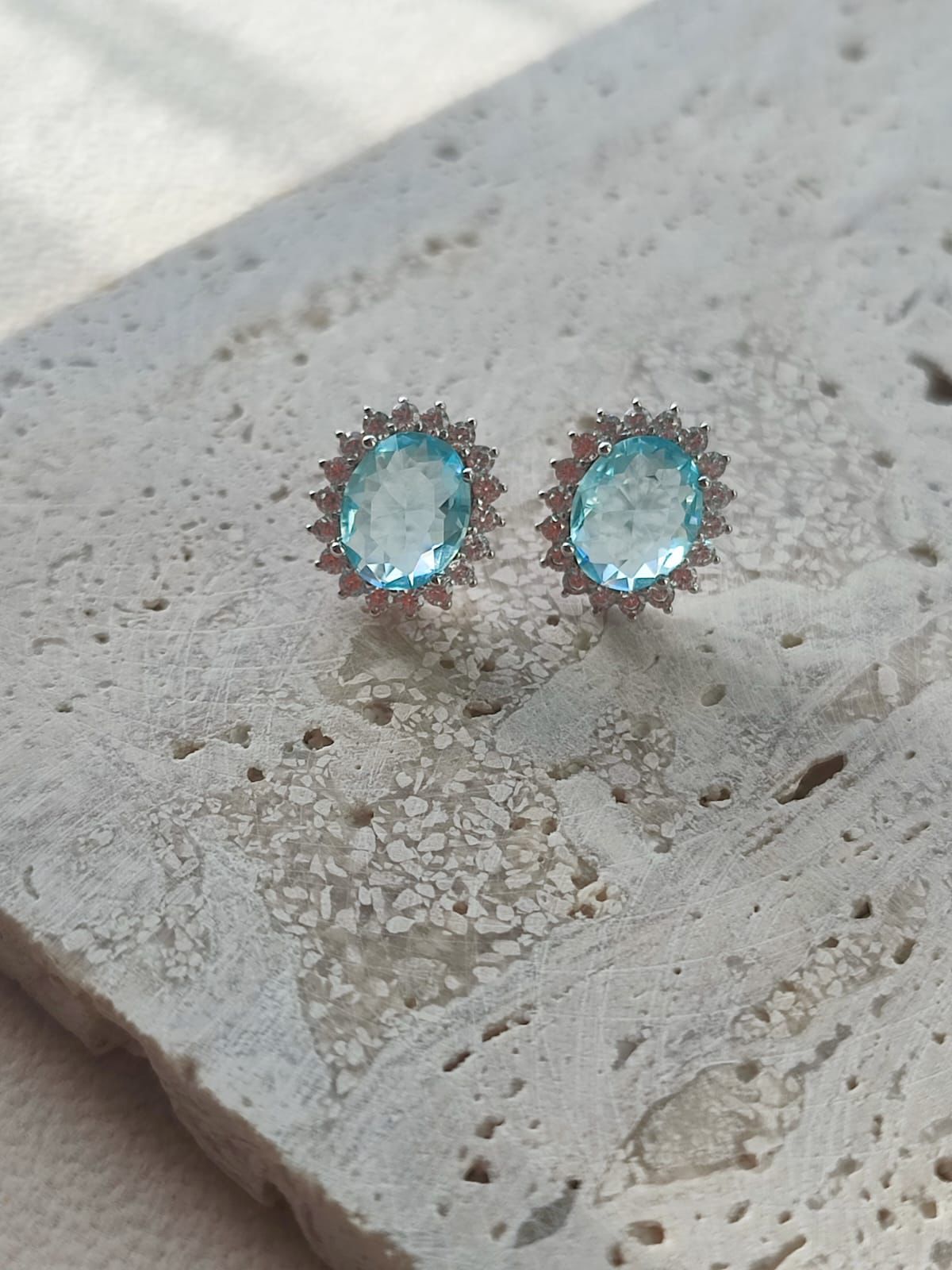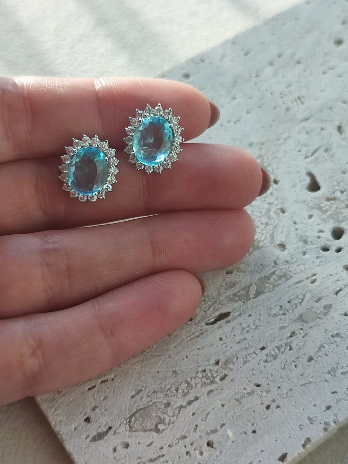 Brinco em prata 925 e banho de ródio, com zircônias em volta e água marinha oval de 8mm no centro.