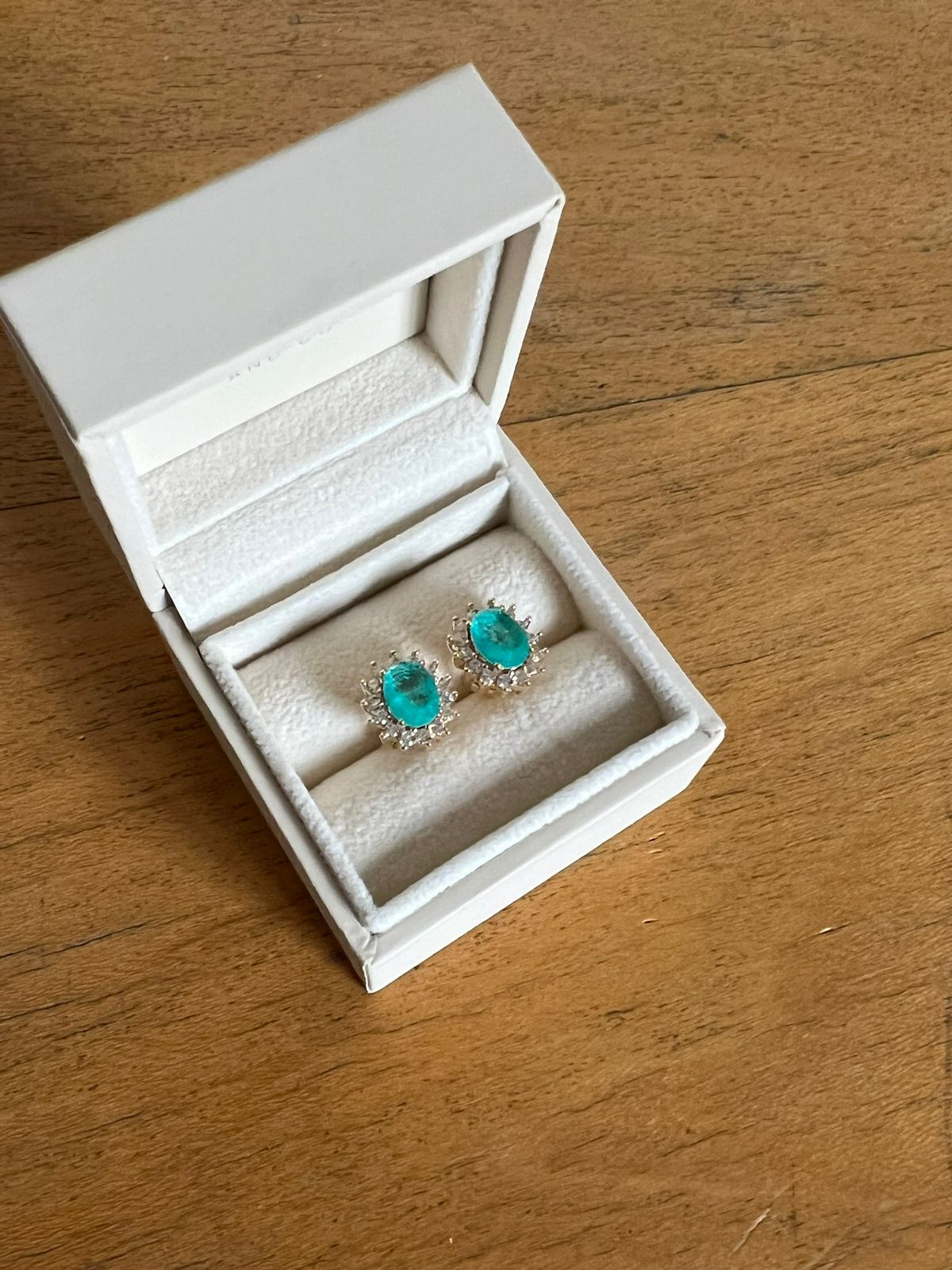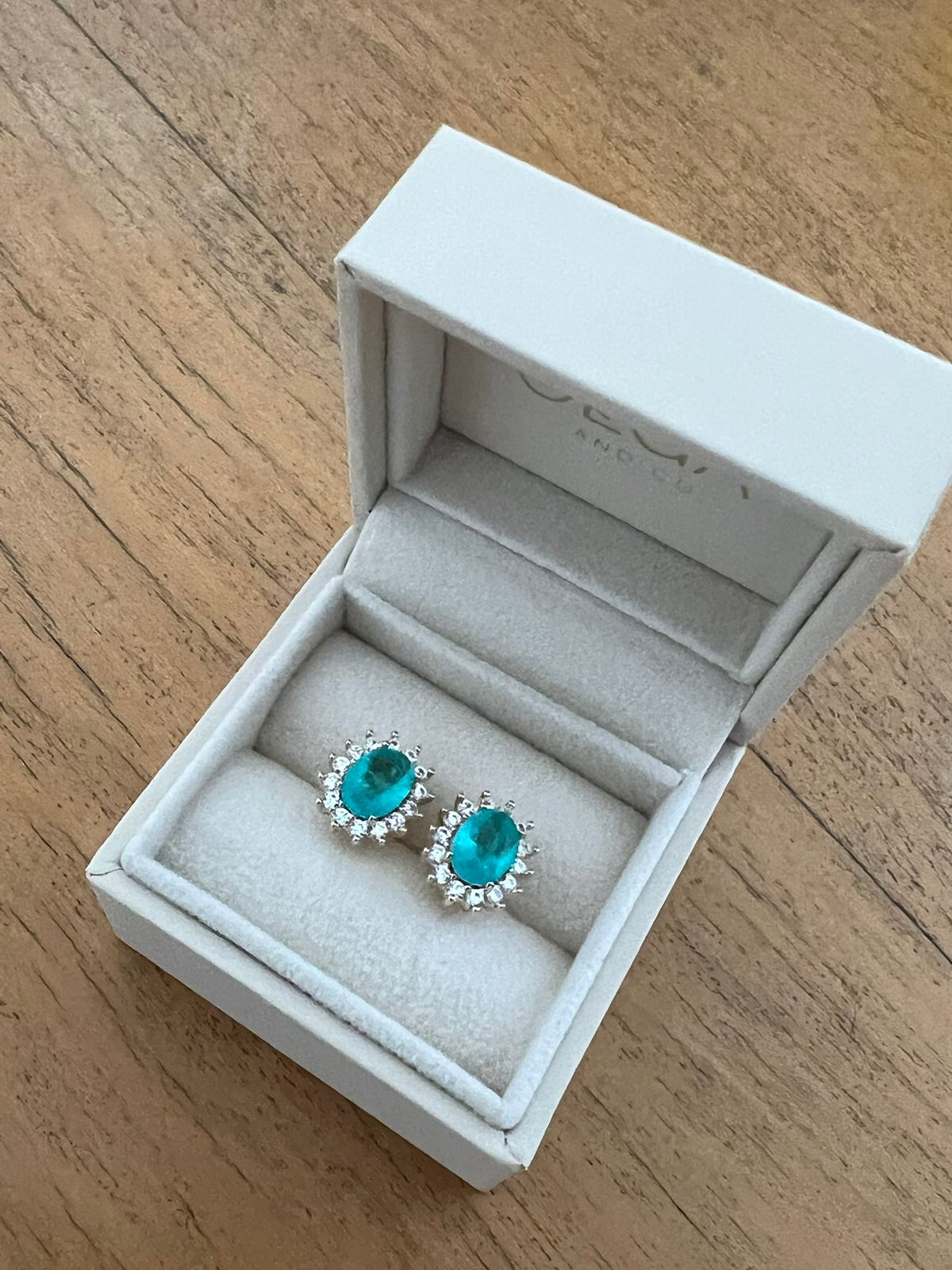 Brinco em prata 925 com banho de ouro, com zircônias cristal em volta e zircônia Paraíba central com 6mm.
