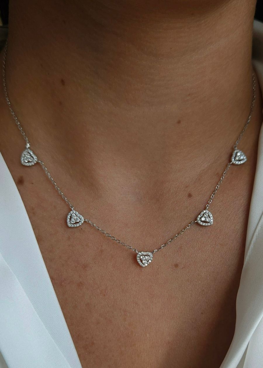 Colar em prata 925 e banho de ródio. Com 5 corações cravejados com zircônia cristal.