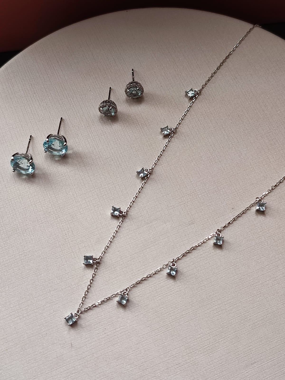 Colar em prata 925 e banho de ródio com qudradinhos água marinha.